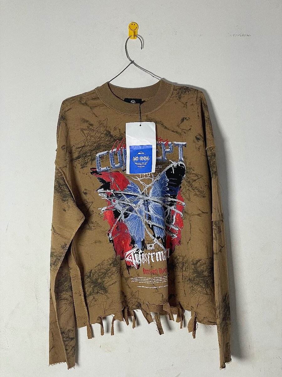 Découvrez ce sweatshirt unique avec un motif papillon et un effet usé. Parfait pour un look urbain décontracté. Matière confortable et design original pour affirmer votre style.