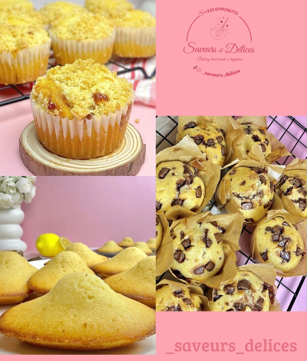 4 muffins aux pépites de chocolat - 4 muffins crumble - 6 madeleine vanille / chocolat.