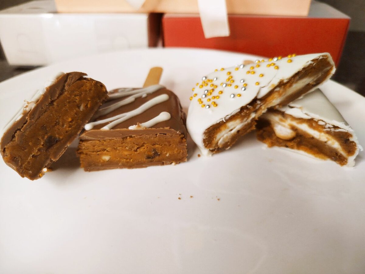 Изысканные десерты на палочке, покрытые настоящим бельгийским шоколадом. Внутри гармоничное сочетание чернослива, орехов и нежного ирисового крема, создающее насыщенный вкус и приятную текстуру. Каждый десерт украшен стильными узорами и изысканными деталями, что делает его не только лакомством, но и элегантным подарком.
