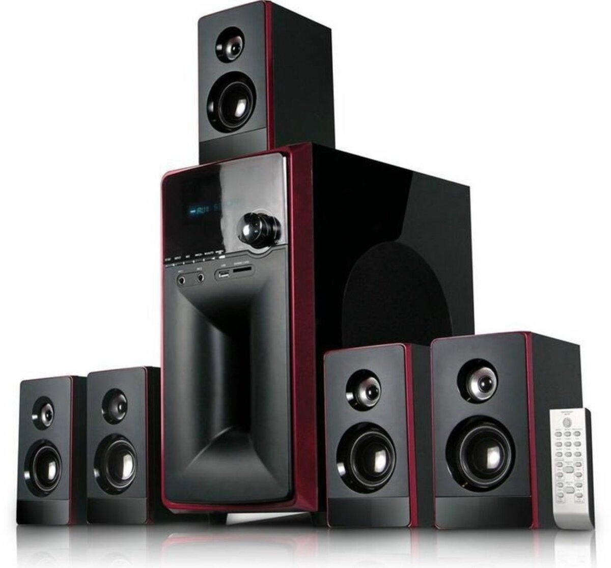 Profitez d'une expérience audio exceptionnelle avec ce système Home Cinéma 5.1 noir. Composé de plusieurs enceintes et d'un caisson de basses, il offre un son surround de haute qualité pour vos films et musiques.