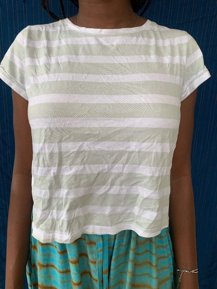 T-shirt à manches courtes en coton doux avec rayures vertes et blanches. Confortable et tendance, parfait pour un look décontracté. Idéal pour le quotidien ou les sorties estivales. Disponible en plusieurs tailles.