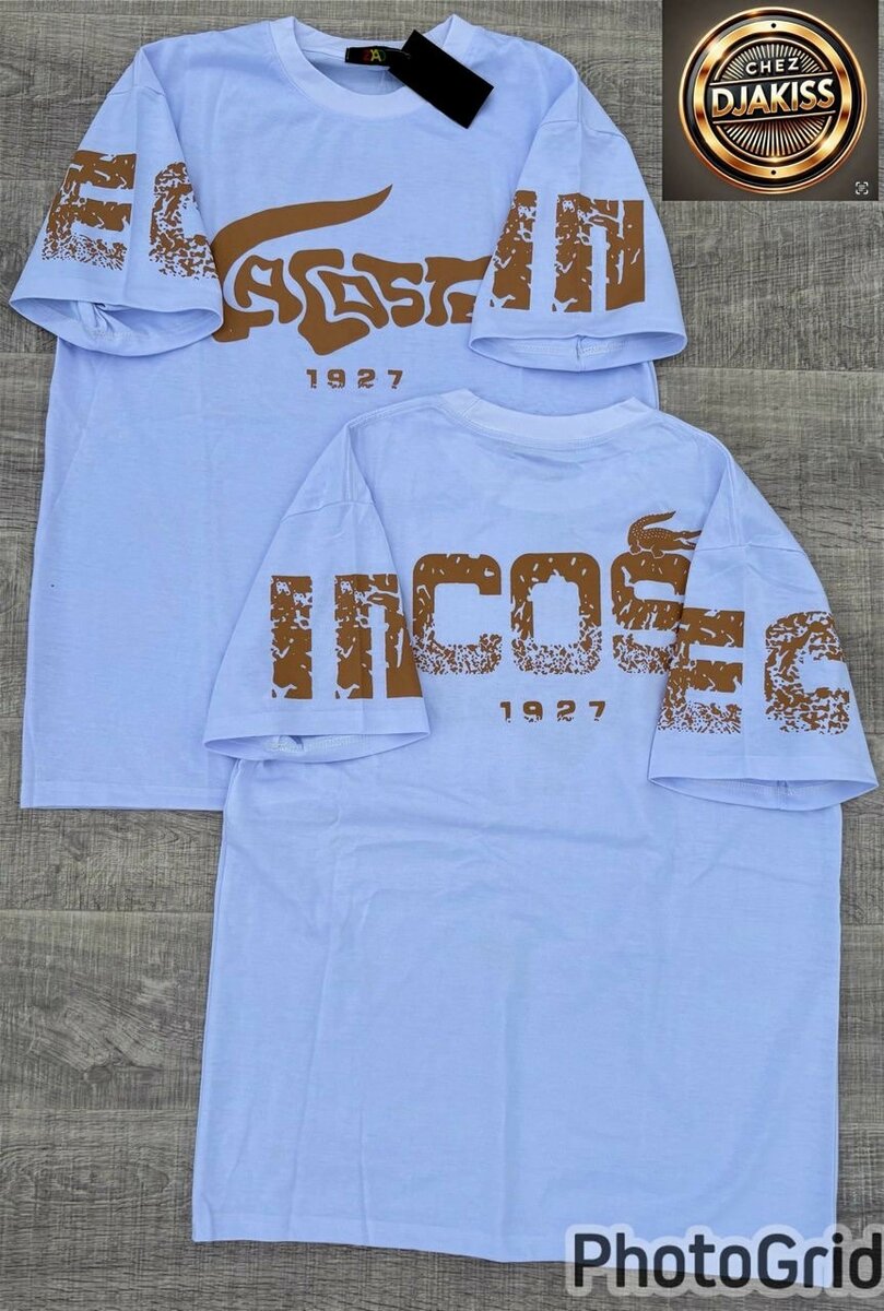 T-shirt blanc avec imprimés graphiques marron, style décontracté et moderne, idéal pour un look urbain.