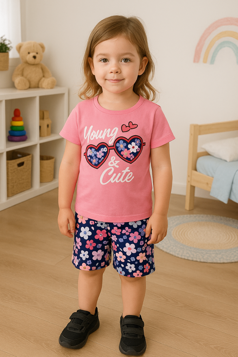 Adorable t-shirt rose pour filles avec un design 'Young & Cute'. Parfait pour le quotidien, offrant confort et style pour les petites fashionistas. Fabriqué en coton doux, idéal pour jouer et explorer.