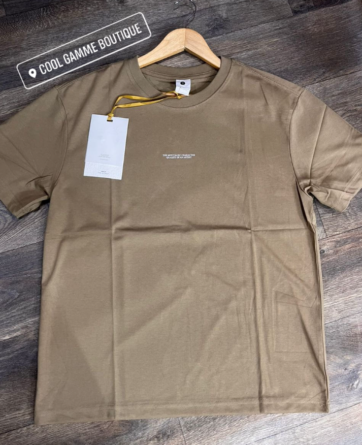 T-shirt pour homme de couleur beige sale avec petit lettrage blanc