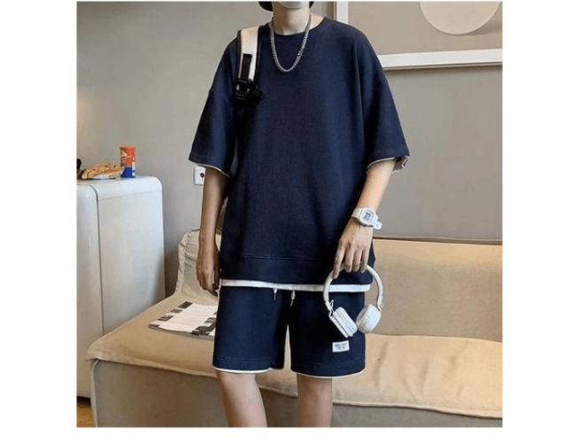 Ensemble homme 2 pièces (t-shirt + short) de couleur bleu marine, confectionné en tissu synthétique léger et confortable. Parfait pour un look décontracté, sportif ou urbain.