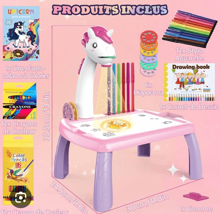 Cette table à dessin licorne pour enfants est équipée de stylos aquarelle, crayons de couleur et livre de coloriage. Idéale pour stimuler la créativité et l'imagination des enfants, elle offre tout le nécessaire pour des heures de plaisir artistique. Parfait pour les petits artistes à la maison.