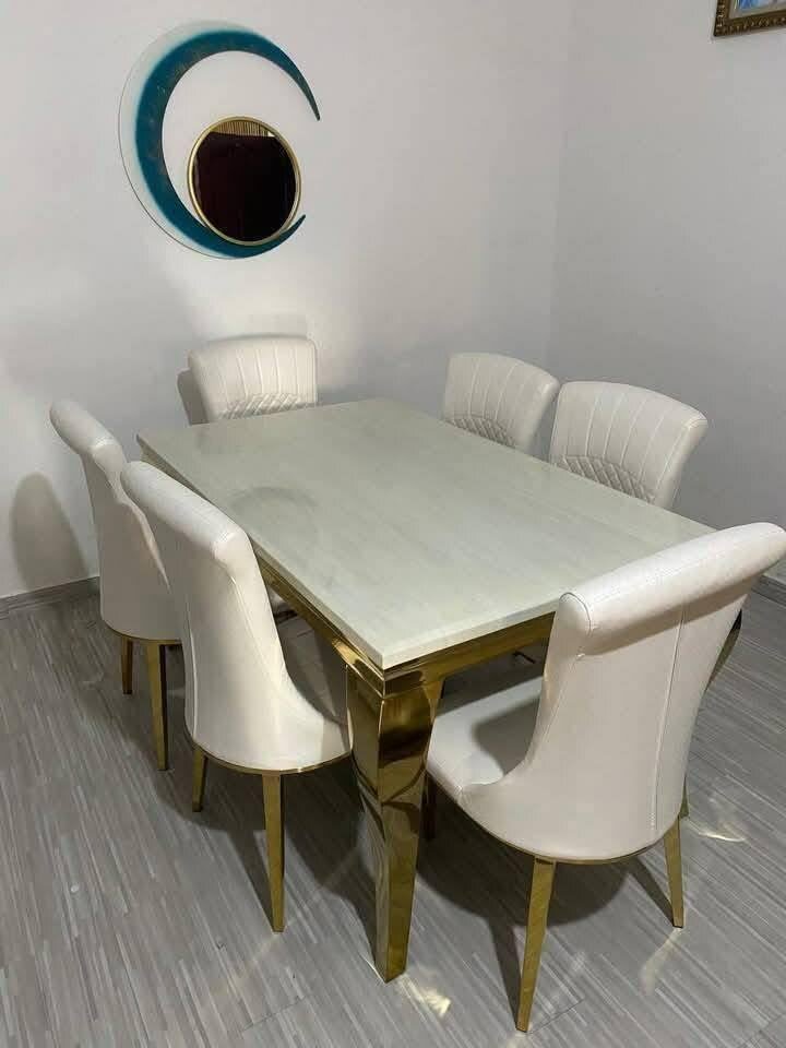 Transformez votre salle à manger avec cette élégante table en marbre moderne, accompagnée d'un ensemble de chaises confortables. Disponible en finitions or et argent, elle s'adapte parfaitement aux intérieurs contemporains.