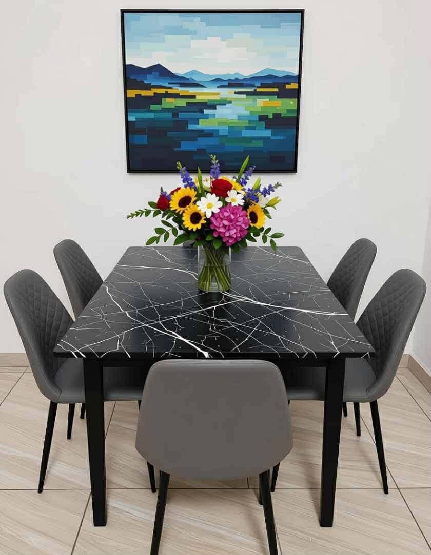Élégante table à manger en marbre pour un intérieur moderne. Son design épuré et ses chaises confortables rendent chaque repas inoubliable. Parfait pour la cuisine ou la salle à manger, il apporte une touche de sophistication.