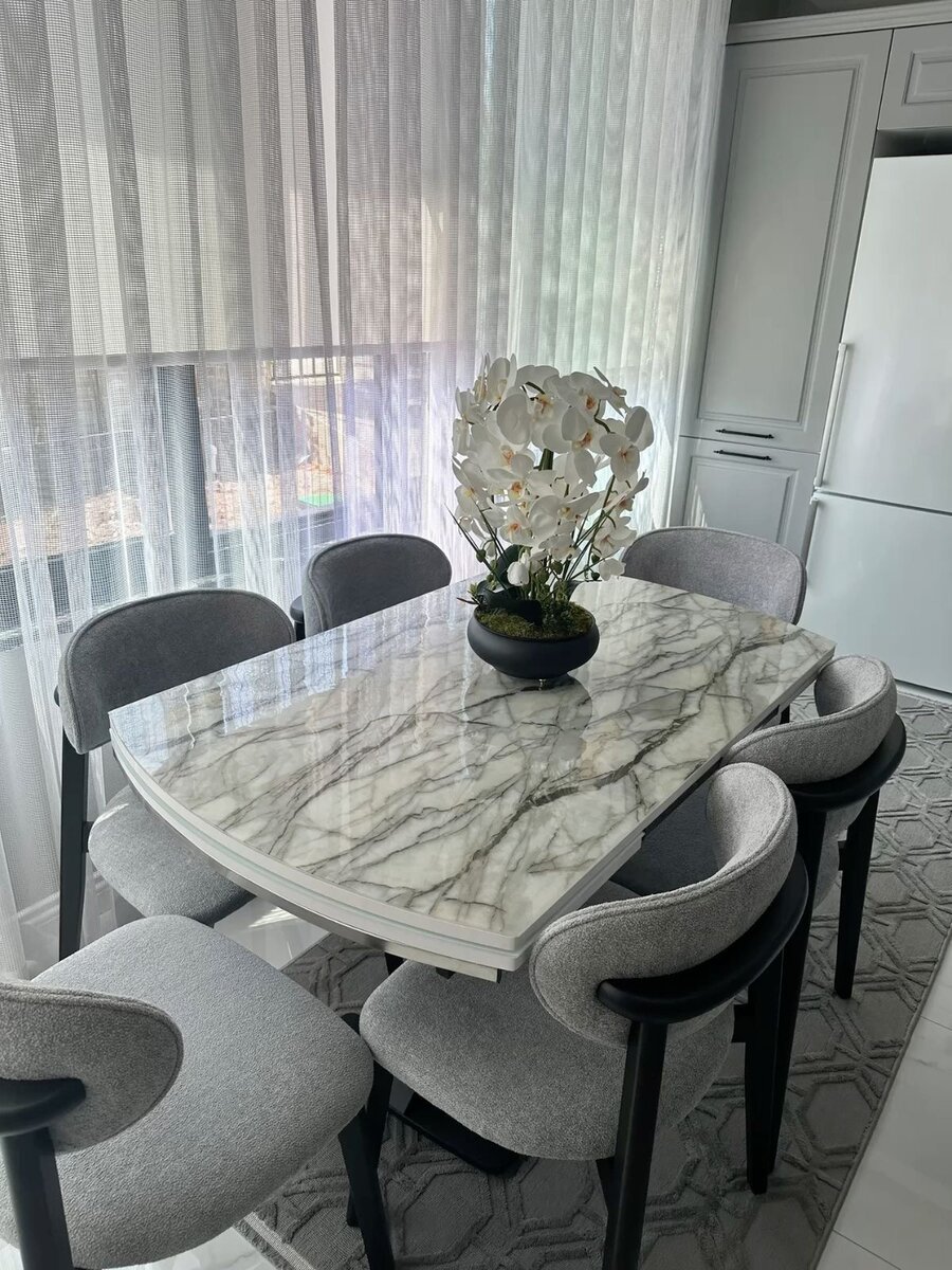 Élégante table à manger avec un plateau en marbre et des chaises confortables. Design moderne et matériaux de haute qualité pour une ambiance raffinée.