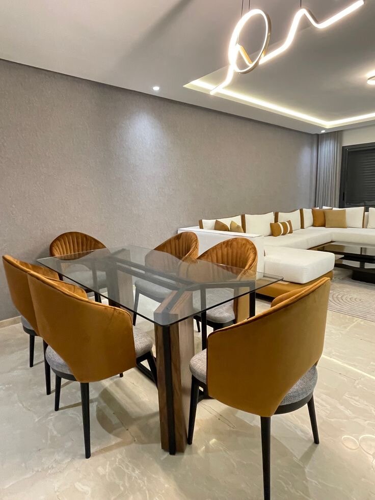 Optez pour cette élégante table à manger moderne en verre, offrant une touche sophistiquée à votre intérieur. Composée de six chaises confortables en velours marron, elle est idéale pour les repas en famille ou entre amis. Design contemporain avec des pieds en bois massif, parfaite pour n'importe quel style de décoration. Transformation assurée de votre salle à manger!
