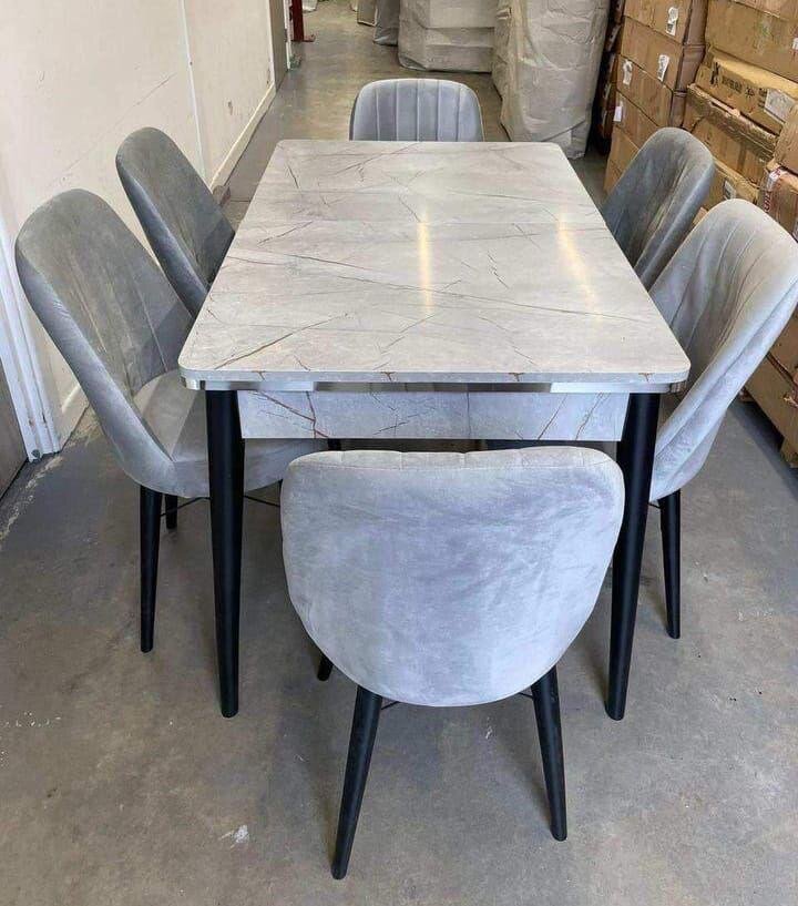 Améliorez votre salle à manger avec cet élégant ensemble de table à manger en marbre et chaises en velours. Parfait pour des dîners en famille ou entre amis.