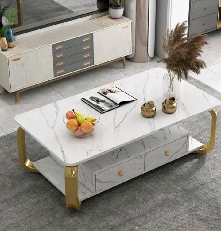 Élégante table basse en marbre blanc avec des finitions dorées. Parfaite pour un salon moderne. 3 tiroirs pour un rangement optimal.