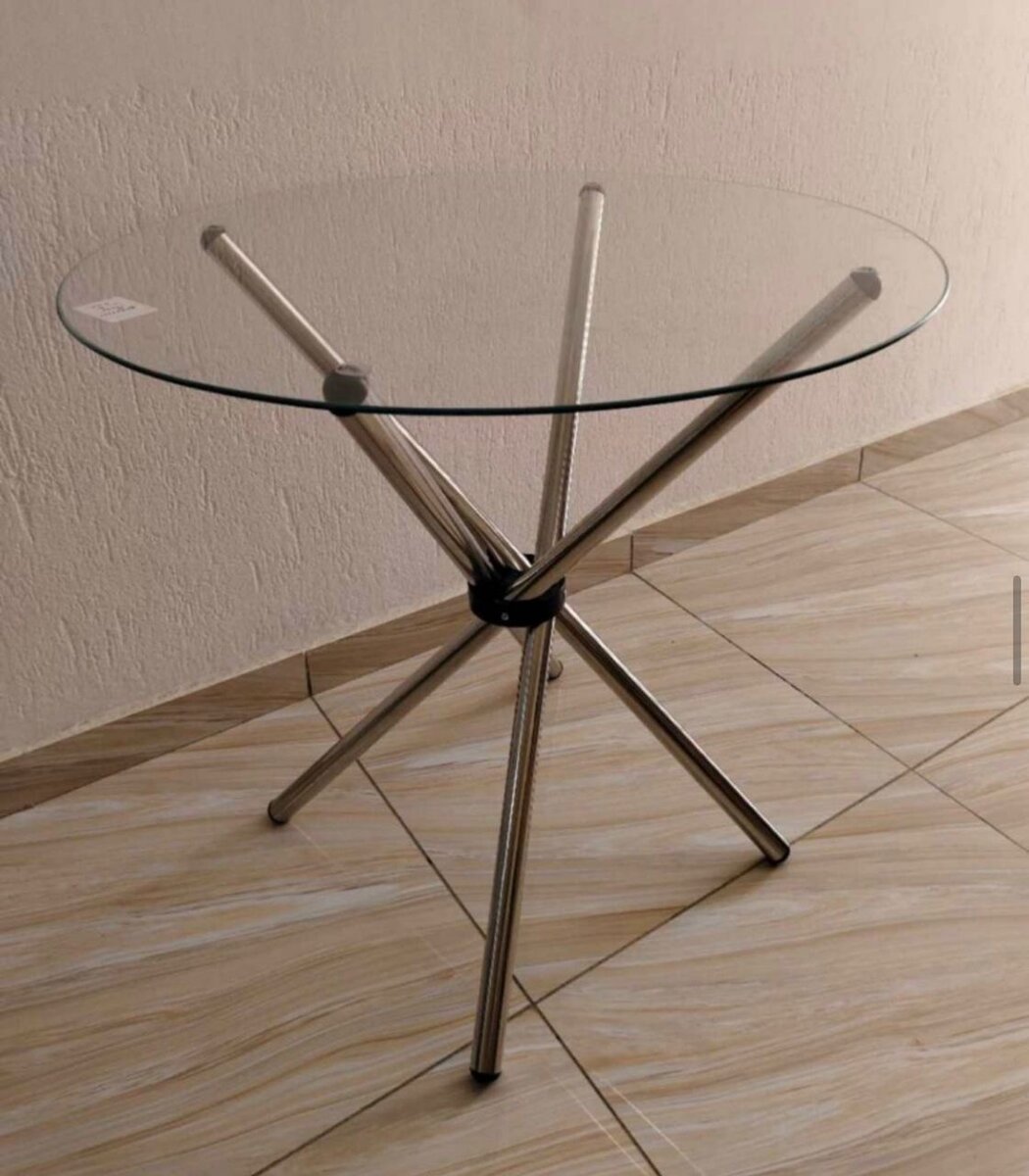 Table basse moderne avec un plateau en verre et un pied en métal. Design élégant et robuste, parfait pour le salon ou la salle à manger.