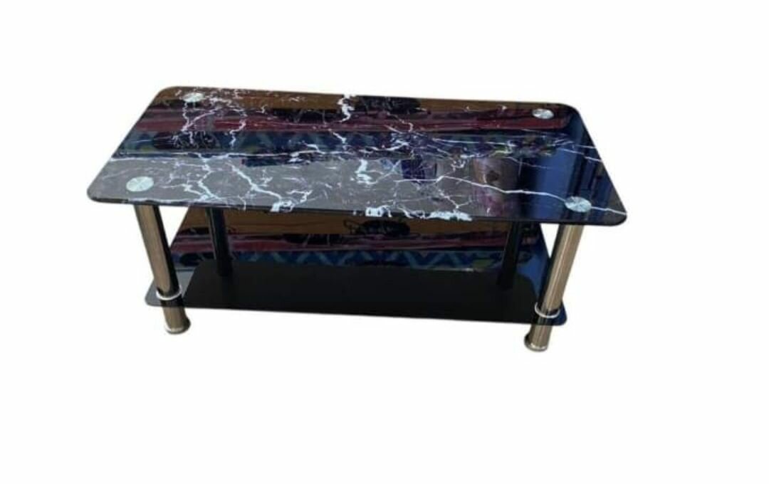 Ajoutez une touche d'élégance à votre salon avec cette table basse en verre au design moderne. La surface en verre trempé avec effet marbre est soutenue par des pieds en métal sophistiqués. Parfait pour des décors contemporains, elle est idéale pour recevoir vos invités ou rehausser votre espace de vie.