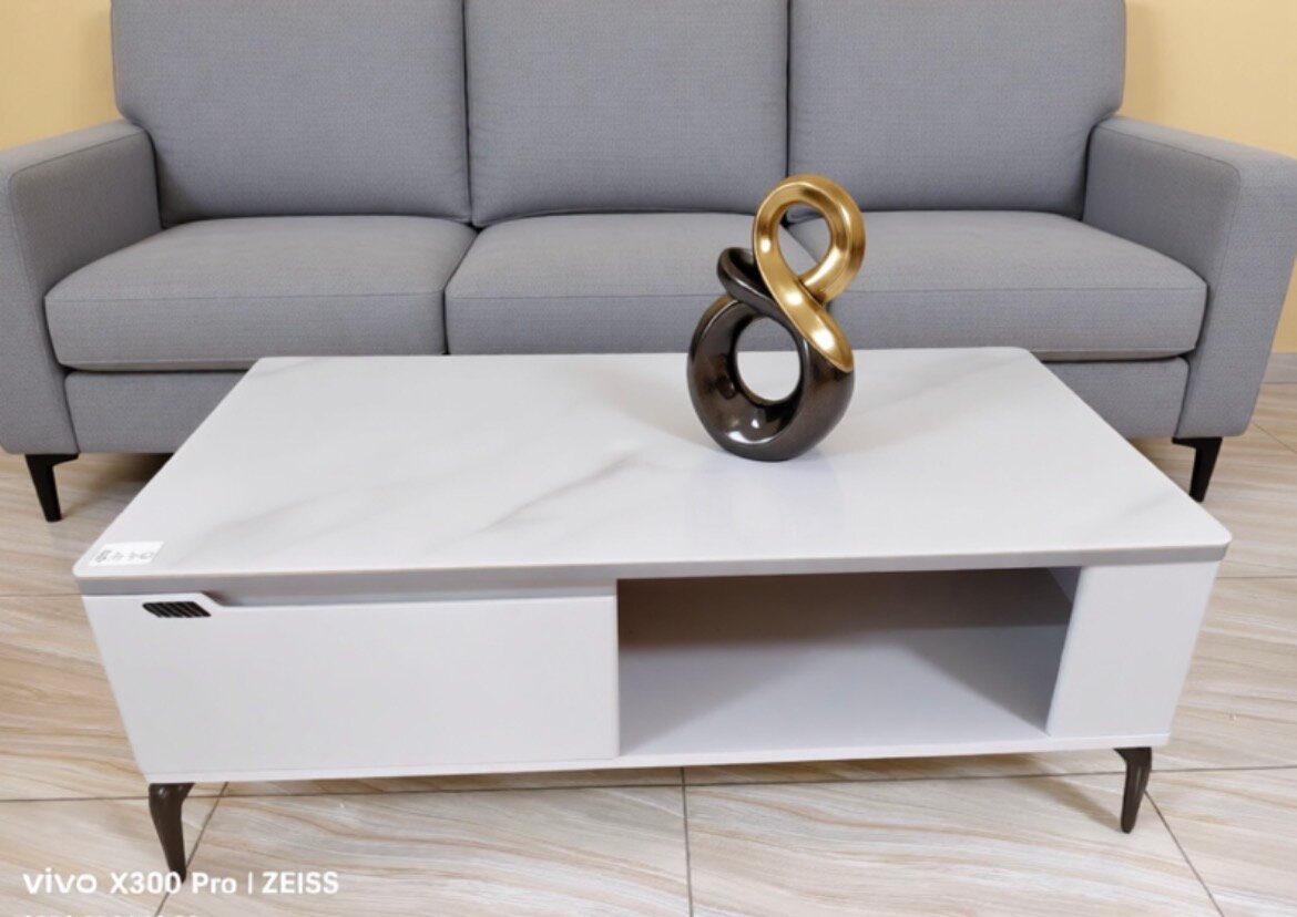 Table basse élégante avec un plateau en marbre blanc et un tiroir. Design moderne et minimaliste, parfait pour un salon contemporain.