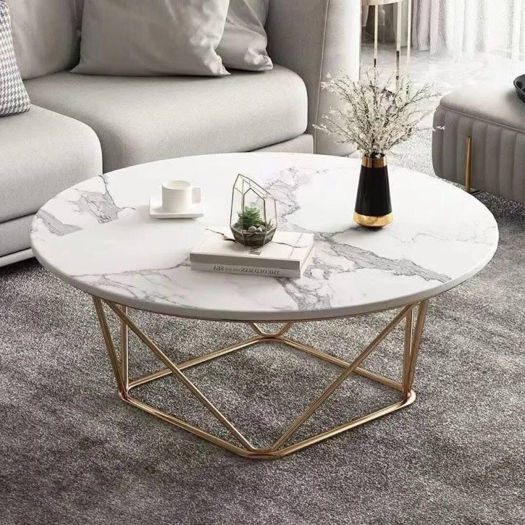 Table basse élégante en marbre avec pied géométrique doré. Idéale pour un salon moderne, ajoutant sophistication et style à votre espace. Parfait pour les réunions ou le café.