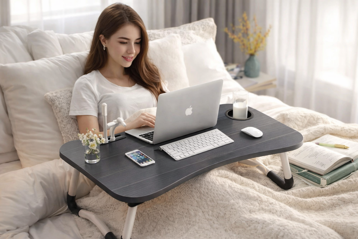 Optimisez votre espace avec cette table de lit pliable et multifonction. Idéale pour travailler confortablement depuis votre lit ou canapé, elle est équipée d'un support tablette, un espace pour souris et une fente pour boisson. Parfaite pour les étudiants, télétravailleurs et amateurs de confort à domicile.