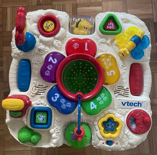 Table d'éveil interactive pour enfants de 6 à 36 mois. Stimule la curiosité avec 6 stations de jeu, 13 chansons, et mode évolutif de sol à table. Parfait pour le développement cognitif et moteur.