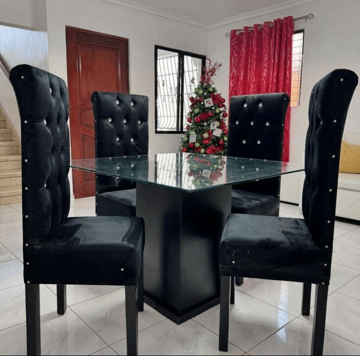 Ajoutez une touche d'élégance à votre salle à manger avec cette table en verre moderne. Conçue avec un plateau en verre transparent et un piétement robuste, elle s'allie parfaitement aux chaises capitonnées noires incluses, assurant un confort et un style indéniables. Idéale pour des dîners sophistiqués ou des réunions familiales intimes.
