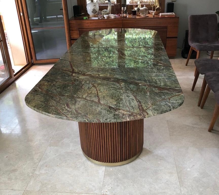 Transformez votre salle à manger avec cette table ovale en marbre vert. Un choix parfait pour les amateurs de design élégant et moderne. Sa surface en marbre offre robustesse et facilité d'entretien, tandis que son pied est sculpté pour ajouter une touche d'élégance. Idéale pour des dîners conviviaux ou des réunions formelles, elle complètera parfaitement votre espace intérieur.