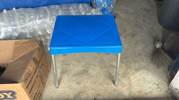 Cette table pliante est idéale pour les événements en plein air, les marchés ou les utilisations domestiques. Sa structure en métal robuste assure une grande stabilité, tandis que son plateau recouvert de plastique bleu est facile à nettoyer.