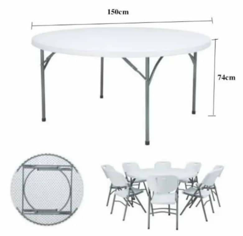 Table pliante ronde et robuste, diamètre 150cm, hauteur 74cm. Parfait pour les événements, réunions en plein air ou décoration intérieure.