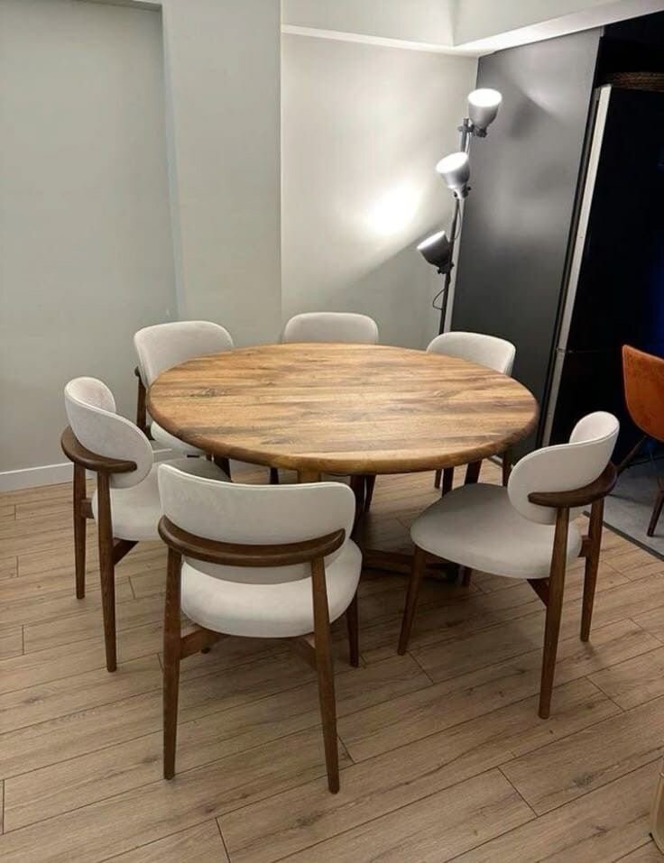 Découvrez cette élégante table ronde en bois avec ses chaises assorties, idéale pour votre salle à manger. Fabriquée avec un fini naturel, elle apporte une touche chaleureuse et moderne à votre intérieur. Parfaite pour accueillir vos invités et créer des moments conviviaux. Convient pour 6 personnes.