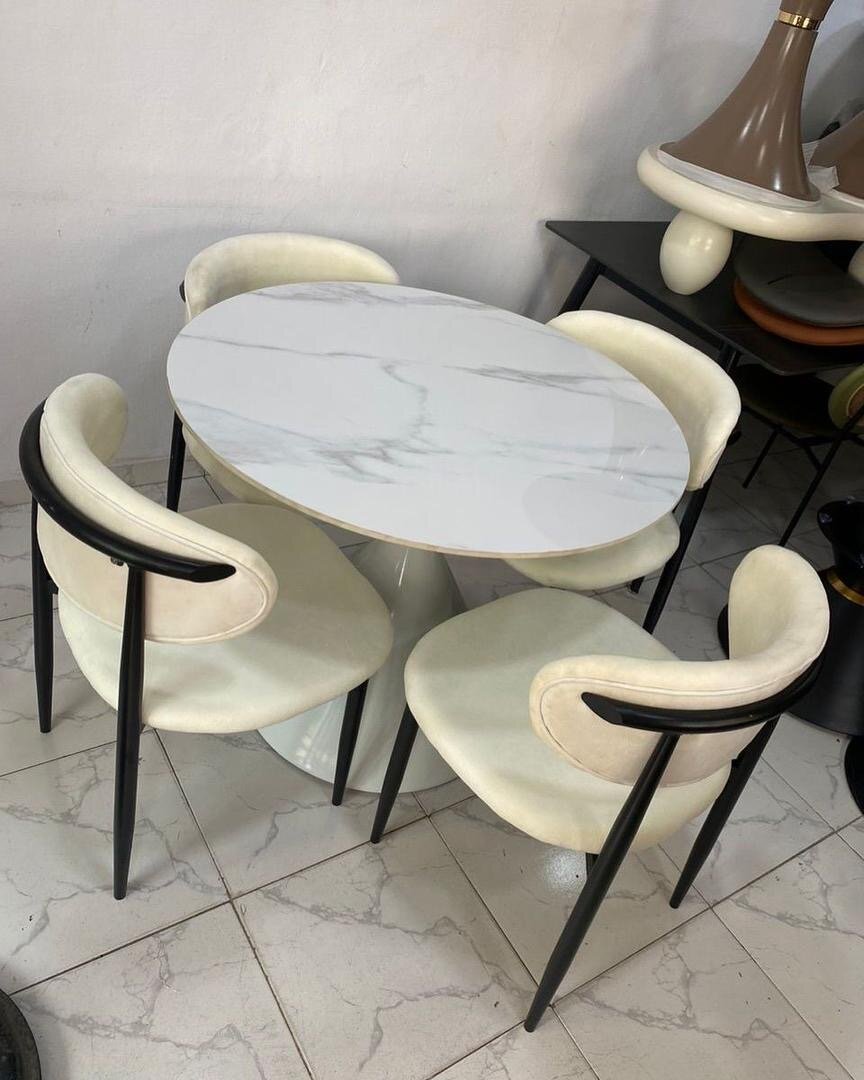Élégante table ronde en marbre avec quatre chaises confortables. Parfait pour une salle à manger moderne. Ajoutez une touche de luxe à votre espace avec cet ensemble raffiné, idéal pour des dîners conviviaux.