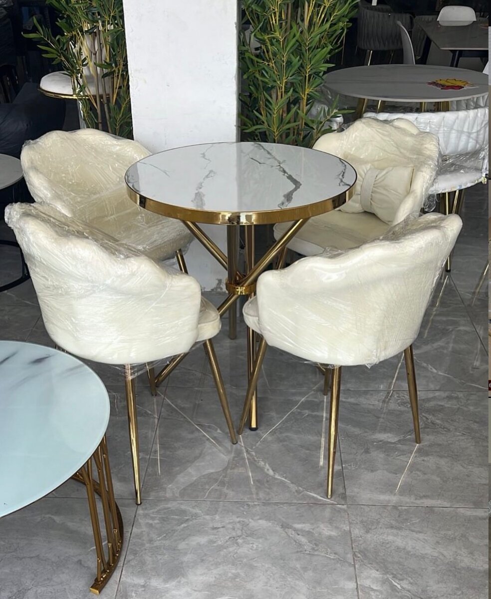 Ensemble élégant de table ronde en marbre avec chaises rembourrées crème. Idéal pour une salle à manger moderne, offrant confort et style. Pieds dorés robustes.