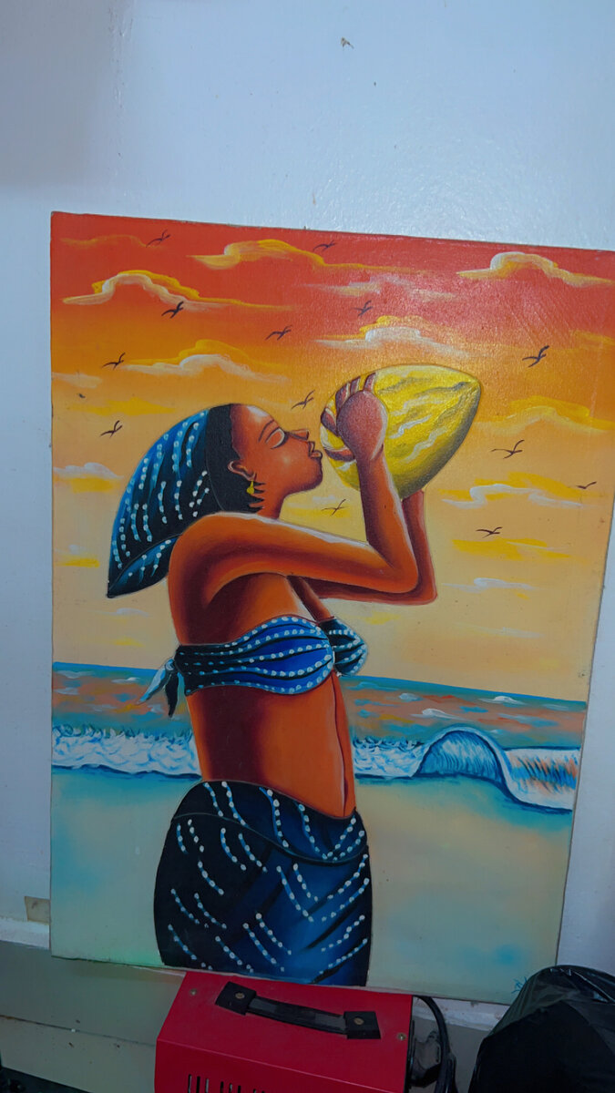 Découvrez ce magnifique tableau représentant une femme au bord de la mer, soufflant dans un coquillage. Parfait pour apporter une touche exotique et chaleureuse à votre intérieur. L'œuvre présente des couleurs vives et un style unique qui évoque les paysages tropicaux. Idéal pour les amateurs d'art et de décoration.