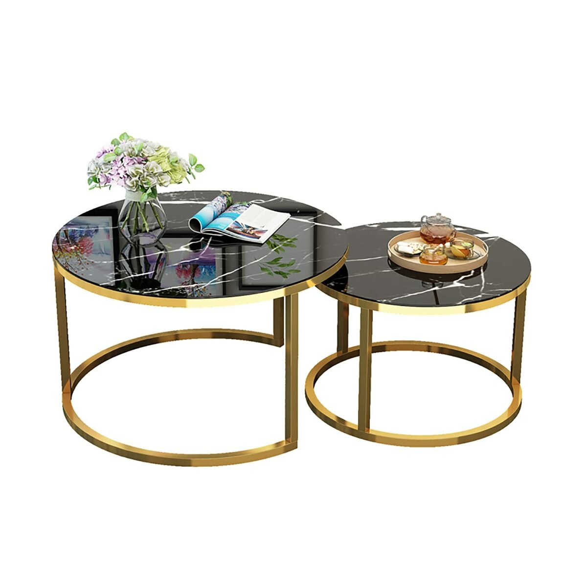 Ensemble de deux tables basses rondes avec plateau en marbre noir et structure dorée. Parfait pour le salon moderne, ajoutant une touche d'élégance et de luxe. Idéal pour exposer des décorations ou servir des rafraîchissements.