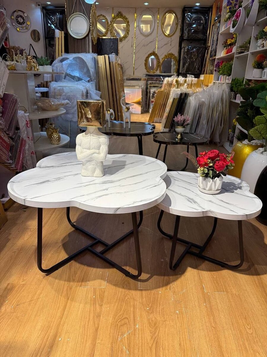 Ensemble de tables gigognes avec finition marbre, idéal pour le salon. Leur design élégant et moderne apporte une touche sophistiquée à votre intérieur. Parfaites pour exposer des objets décoratifs ou servir de table basse lors de réceptions.