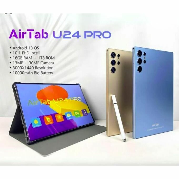 Découvrez la tablette AirTab U24 PRO avec écran FHD de 10,1 pouces, Android 13, caméra 13MP + 30MP. 16 Go RAM et 1 To ROM, idéale pour le multitâche. Batterie 10000mAh pour une autonomie prolongée. Parfaite pour le travail et le divertissement!