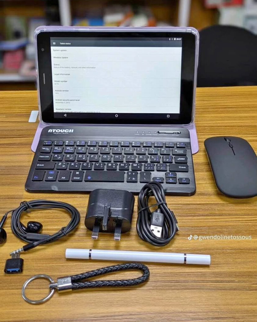 Découvrez la tablette moderne accompagnée d'un clavier Bluetooth détachable, idéale pour le travail et le divertissement. Conçue pour une utilisation flexible, elle inclut un stylet, une souris sans fil et des accessoires nécessaires pour une productivité maximale. Compagnon parfait pour les étudiants et les professionnels en déplacement.