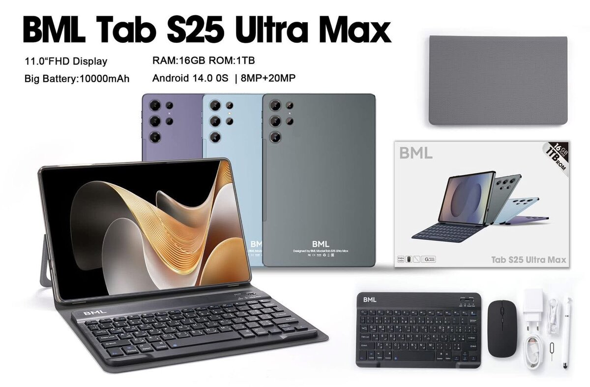 Découvrez la BML Tab 18 Max avec écran FHD 11", 16GB RAM, 1TB ROM. Batterie 10000mAh pour une autonomie exceptionnelle. Parfaite pour le travail et le divertissement avec Android 14.