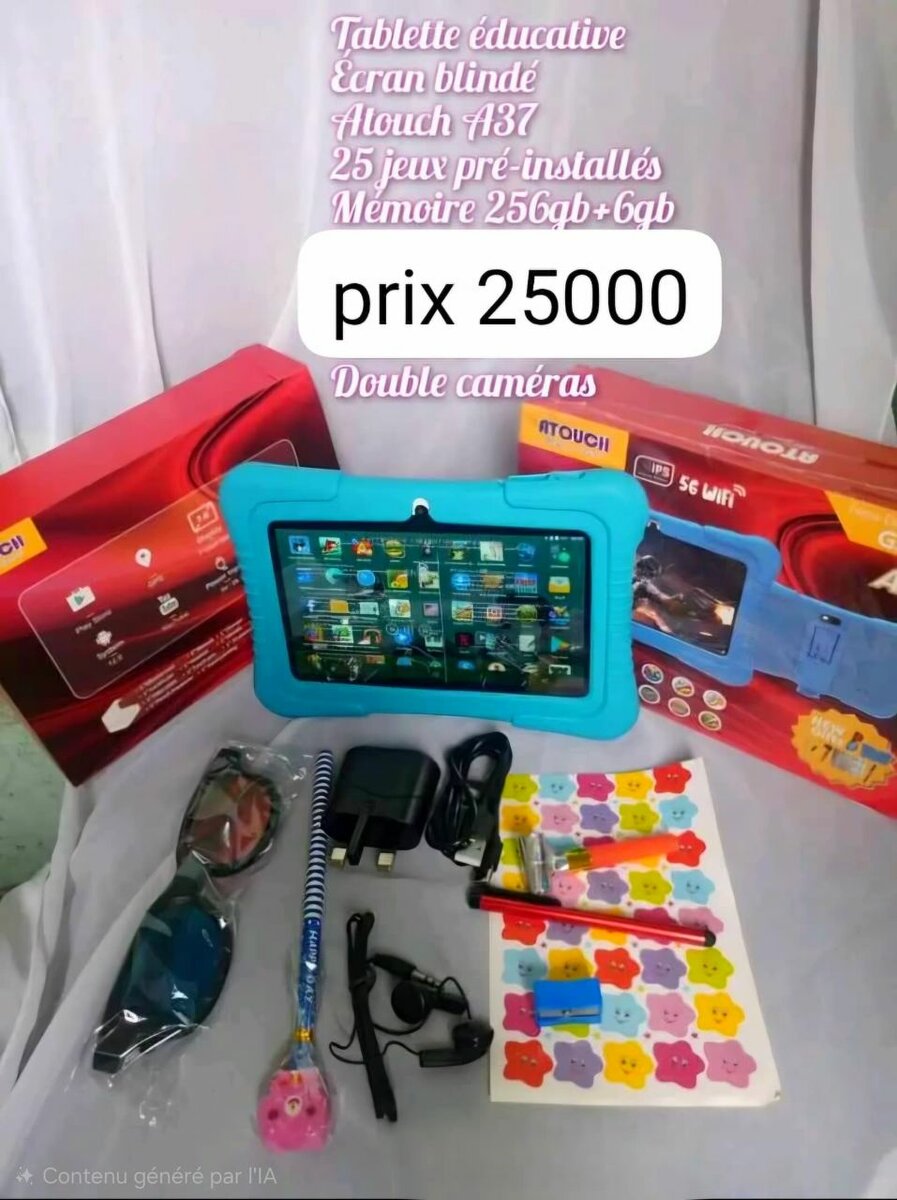 Cette tablette éducative pour enfants, modèle Atouch A37, dispose d'un écran blindé et double caméras. Profitez de 25 jeux préinstallés et d'une mémoire de 256GB+6GB. Parfait pour l'éducation et le divertissement sécurisés des enfants.