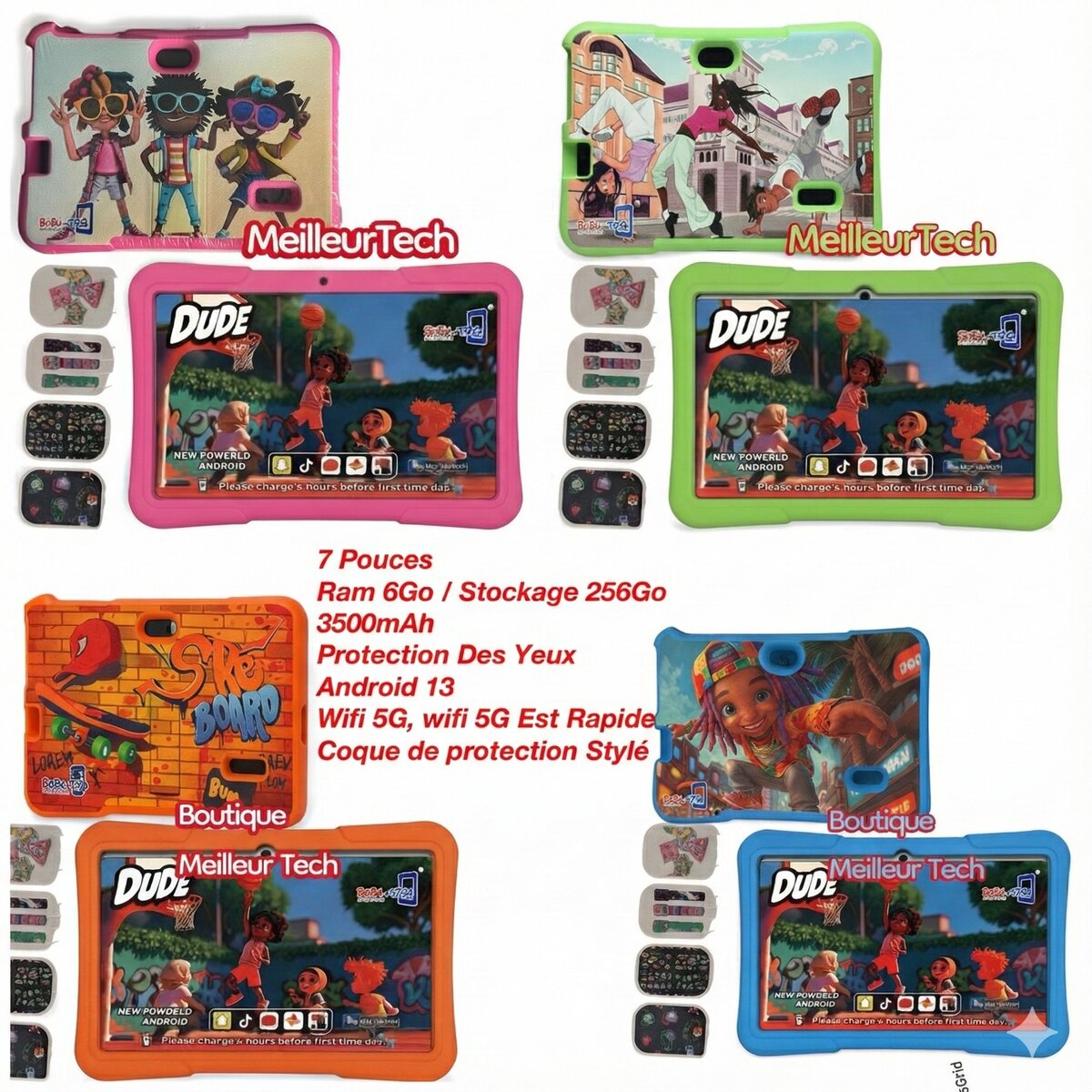 Découvrez la tablette pour enfants de 7 pouces avec Android 13, RAM 6Go et stockage de 256Go. Idéale pour l'éducation et le divertissement des plus jeunes, elle dispose d'une protection des yeux et d'une coque résistante. Dotée du WiFi 5G puissant, c'est le choix parfait pour un usage quotidien sécurisé et ludique.