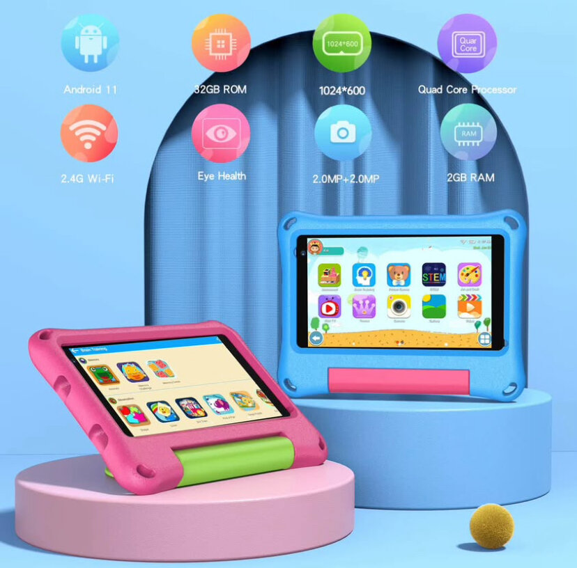 Tablette éducative Android 11 avec écran 1024x600, processeur Quad Core. Idéale pour enfants, avec filtres de santé oculaire et jeux éducatifs. Sécurisée et durable, parfaite pour apprendre en s'amusant.