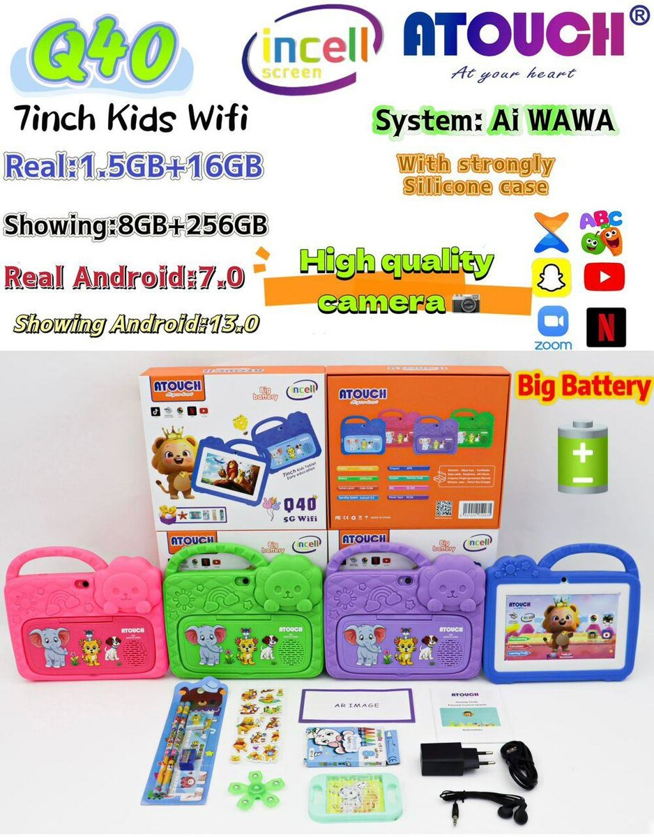 Offrez à vos enfants la tablette ATOUCH Q40, 7 pouces, dotée d'un système Android 7. Avec un espace de stockage de 8GB+256GB et une RAM de 1.5GB+16GB, elle inclut une coque en silicone résistante et de nombreuses applications éducatives. Idéale pour l'apprentissage à domicile avec sa caméra de haute qualité et sa grande autonomie.