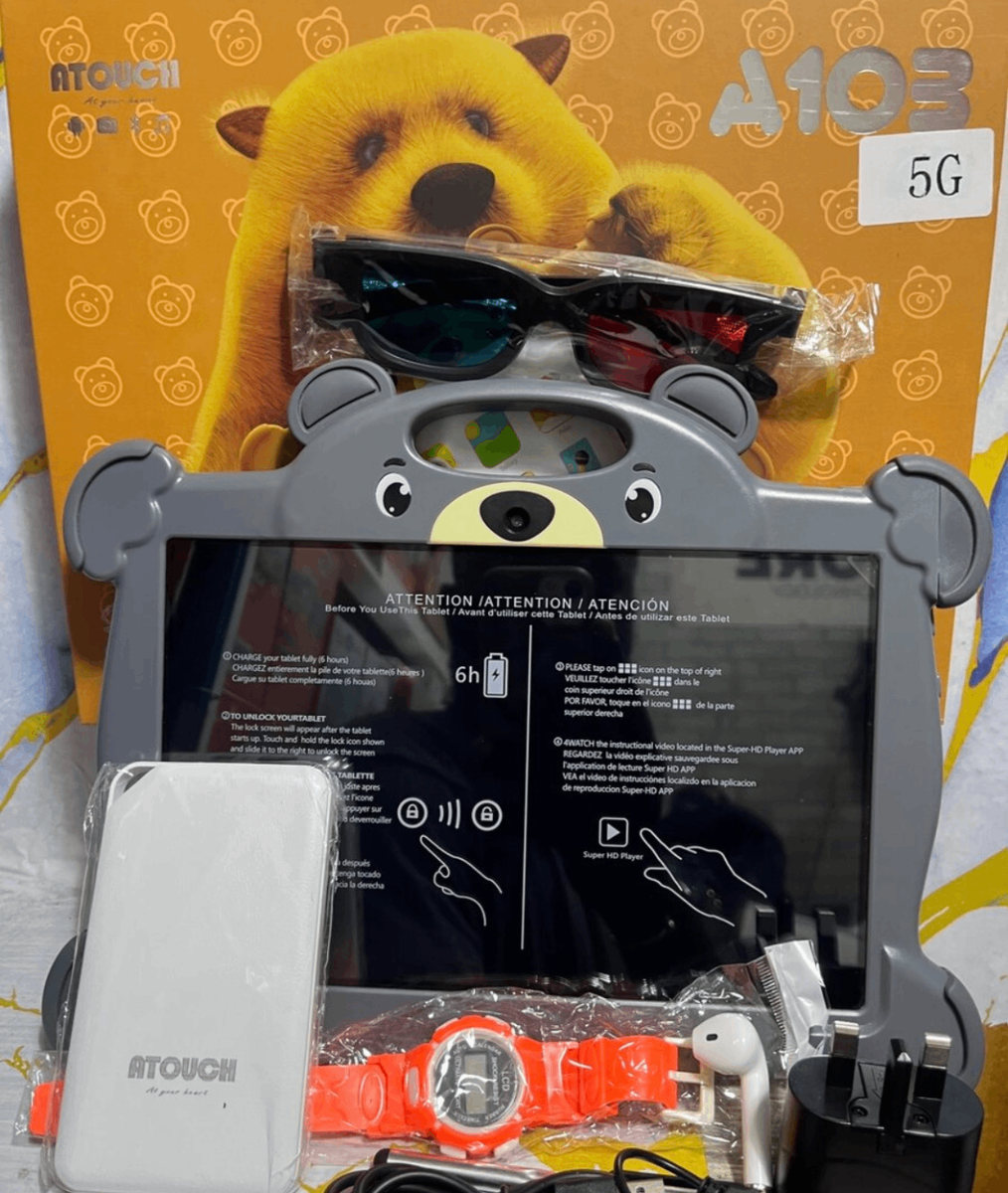 Offrez à votre enfant la tablette ATOUCH A103 5G, un choix amusant et éducatif. Conçue avec un design d'ours mignon, elle inclut des accessoires sympas comme des lunettes 3D. Idéale pour le divertissement et l'apprentissage, elle garantit des heures de plaisir. Parfaite pour des séances de cinéma à la maison avec sa connectivité 5G rapide.
