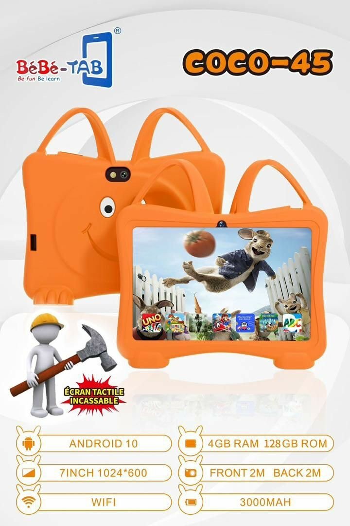 La tablette BébéTab COCO-45 est idéale pour les enfants grâce à son étui résistant en forme d'éléphant. Équipée d'Android 10, d'un écran 7 pouces, de 4 Go RAM et d'une capacité de 128 Go ROM. Parfaite pour l'éducation et le divertissement des enfants avec accès WiFi et caméra frontale et arrière.