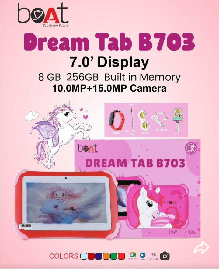 Offrez à votre enfant la Dream Tab B703, une tablette ludique avec écran 7 pouces, 8 Go RAM et caméra 15 MP. Idéale pour l'apprentissage et le divertissement avec un design enchanteur.