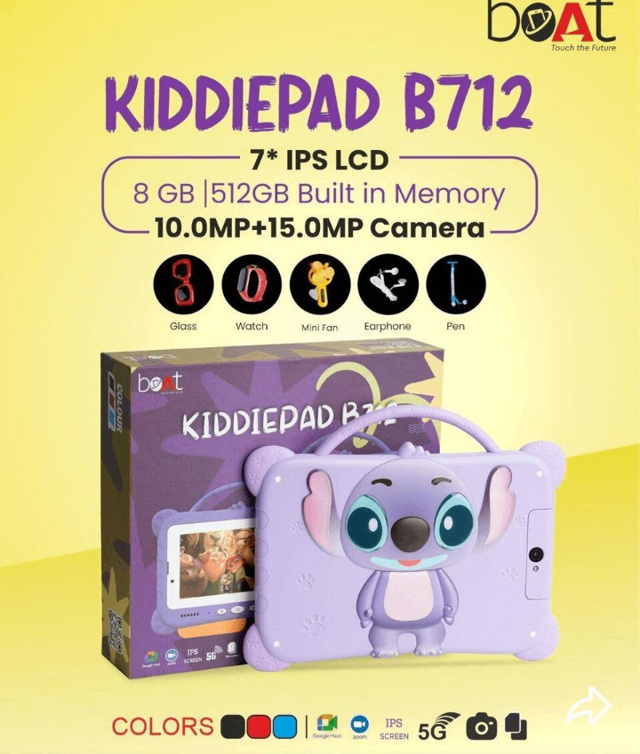 La tablette KIDDIEPAD B712 est parfaite pour les enfants. Avec un écran IPS de 7", elle offre des performances exceptionnelles grâce à ses 8 Go de RAM et son stockage de 512 Go. Capturez chaque moment avec les caméras 10MP et 15MP. Inclut des accessoires amusants comme une mini-ventilateur et un stylo.