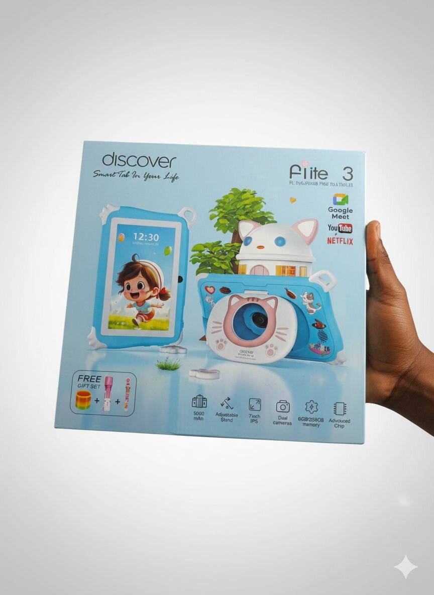 Le paquet inclut une coque antichoc, un casque, et un stylet, avec des applications pré-installées comme YouTube et Netflix.