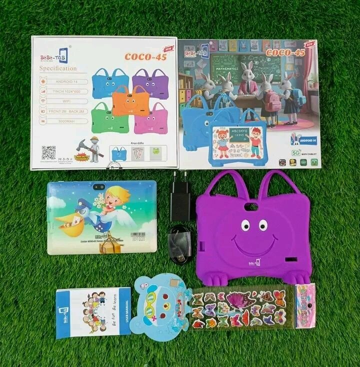 Tablette éducative COCO-45 avec coque protectrice colorée. Écran ajusté pour les enfants, applications ludiques et éducatives. Parfait pour l'apprentissage et le divertissement sécurisé des enfants. Comprend des autocollants amusants pour personnalisation.