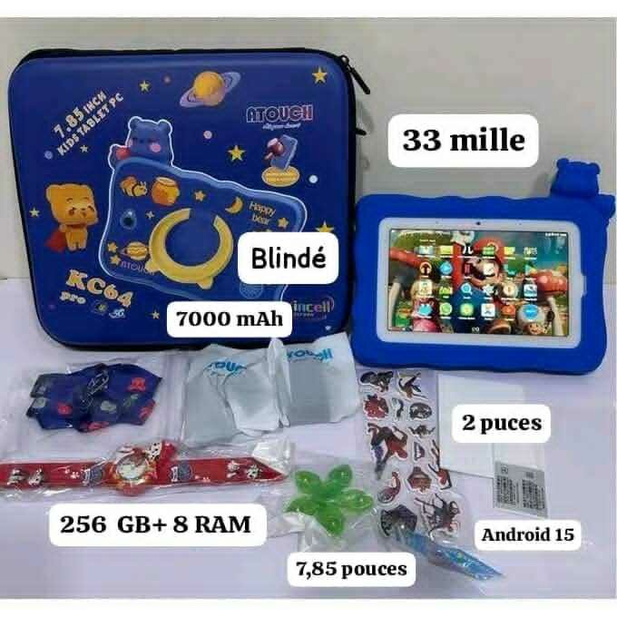 Tablette tactile Android 15, 8Go RAM, 256Go stockage, batterie 7000mAh. Livrée avec étui de protection et accessoires. Idéal pour les enfants, utilisation intuitive et sécurisée.