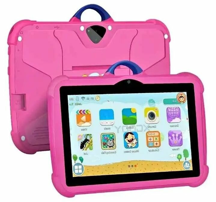 Tablette tactile pour enfant, idéale pour les jeux éducatifs et divertissants. Protégée par une coque robuste rose.