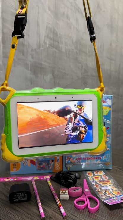 Tablette tactile pour enfants avec étui protecteur et accessoires. Parfaite pour apprendre et divertir, idéale pour les cours en ligne et les activités créatives.