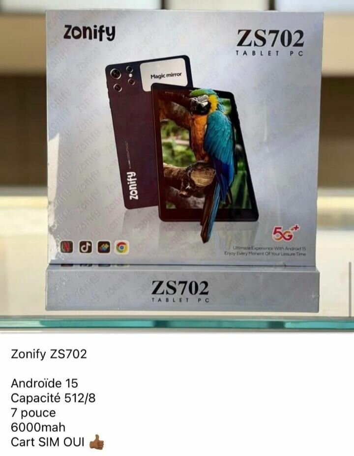 Découvrez la tablette Zonify ZS702 avec écran 7 pouces, Android 15, et stockage de 512/8 Go. Batterie 6000mAh pour une utilisation prolongée. Compatible carte SIM 5G, idéale pour la connectivité en déplacement.