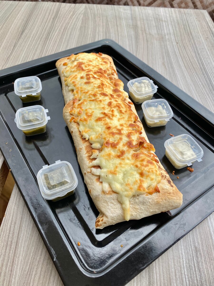 Délicieux Tacos XXL gratiné, composé de la viande de votre choix (poulet, bœuf haché, steak ou tenders), généreusement nappé dune somptueuse sauce blanche, accompagné de pommes de terre fondantes et recouvert dun fromage fondant irrésistible